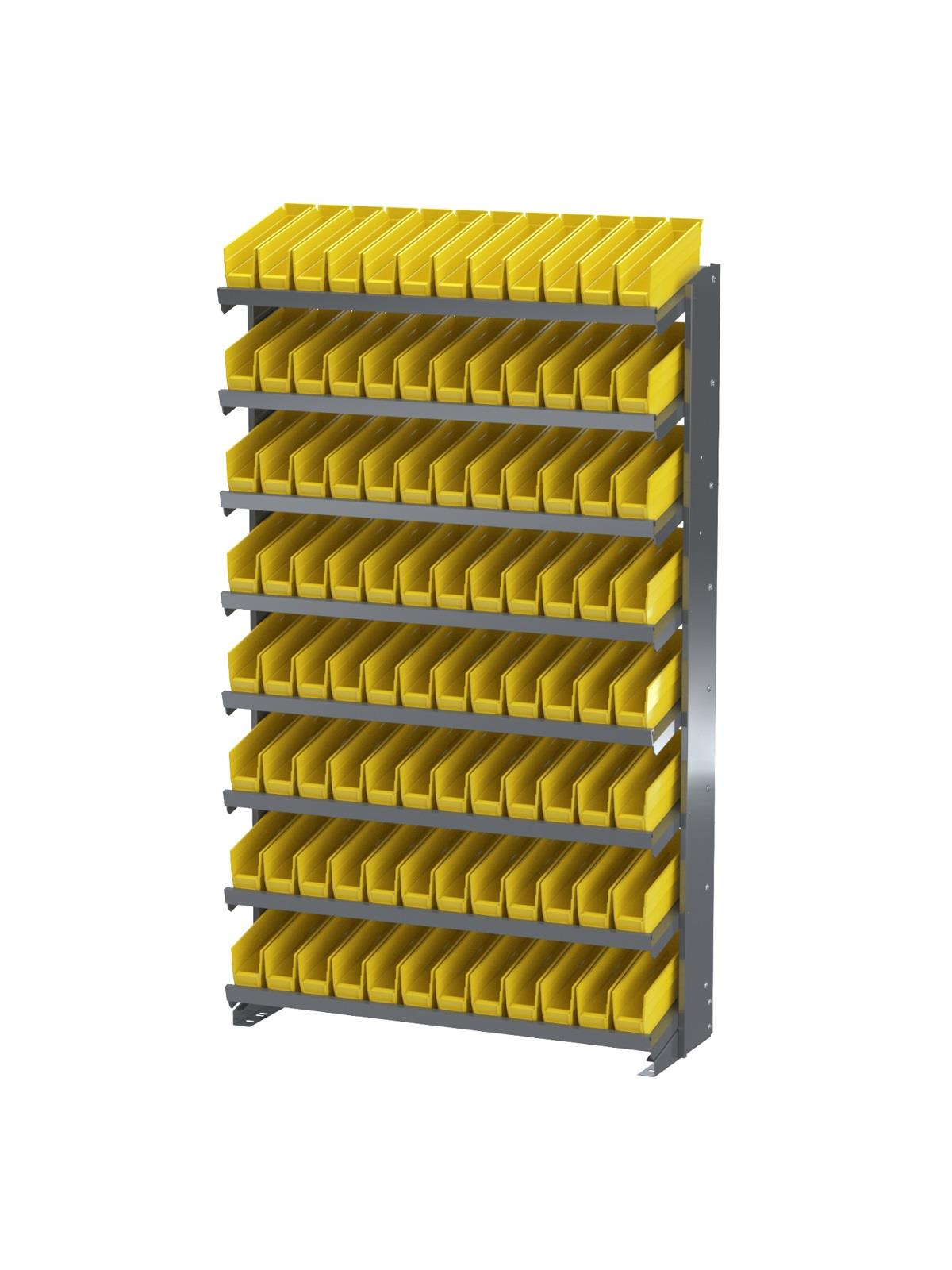 Angled shelves keep small parts in the front of the bins for easy viewing and picking. Convenient heavy-duty storage. Handsome Gray baked-enamel finish. Bins available in Red, Yellow, Blue, Green, or Semi-Clear. FOB Shipping Point.
