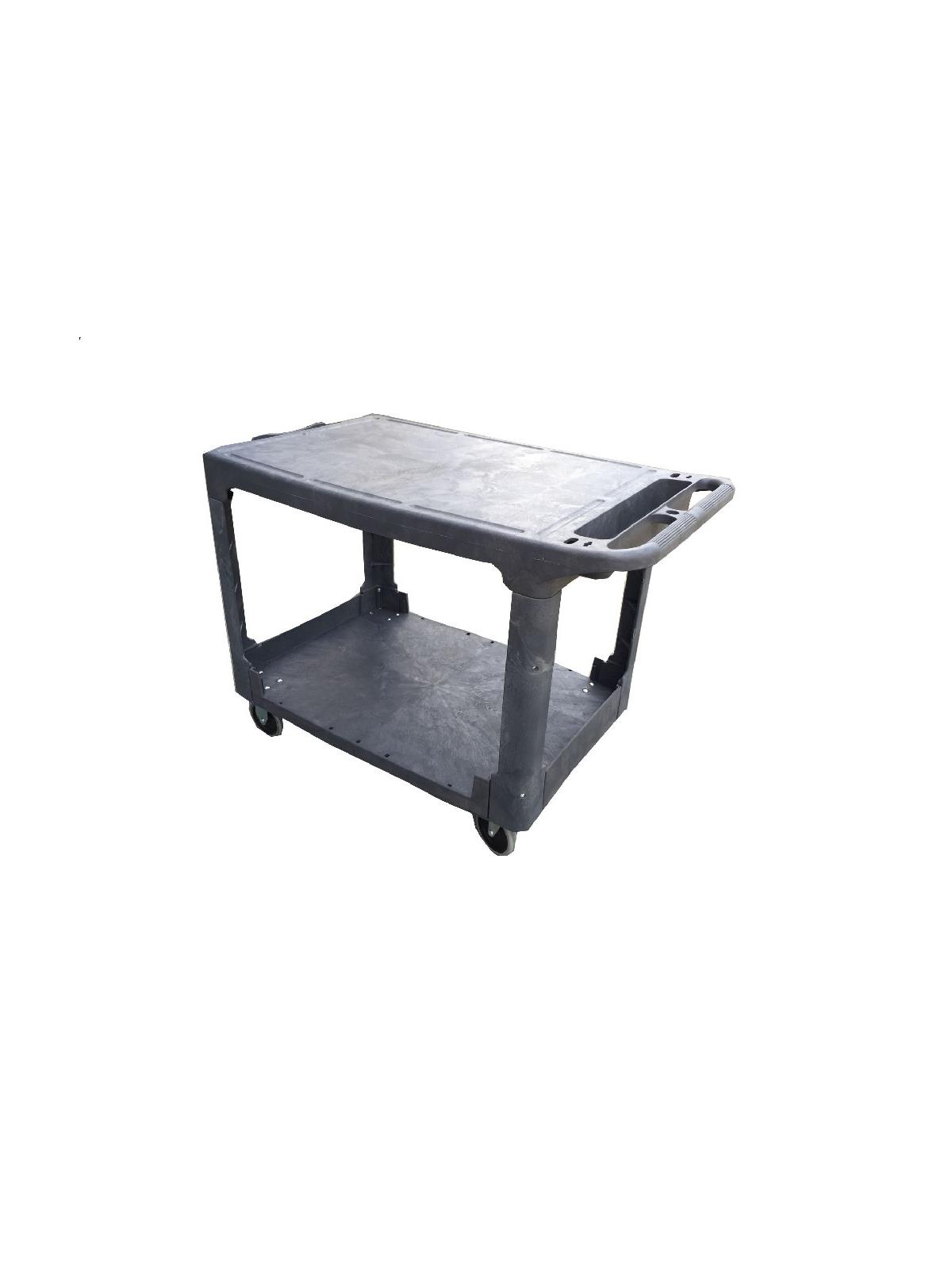 Manufactured from Heavy Duty plastic. Round corners to prevent wall damage and has storage in the handle. Lip-Up carts are Gray in color. Lip-Down carts are Black. Both with 5" non-marking casters, 2 swivel, 2 rigid. 4" deep shelves. FOB Shipping Point.