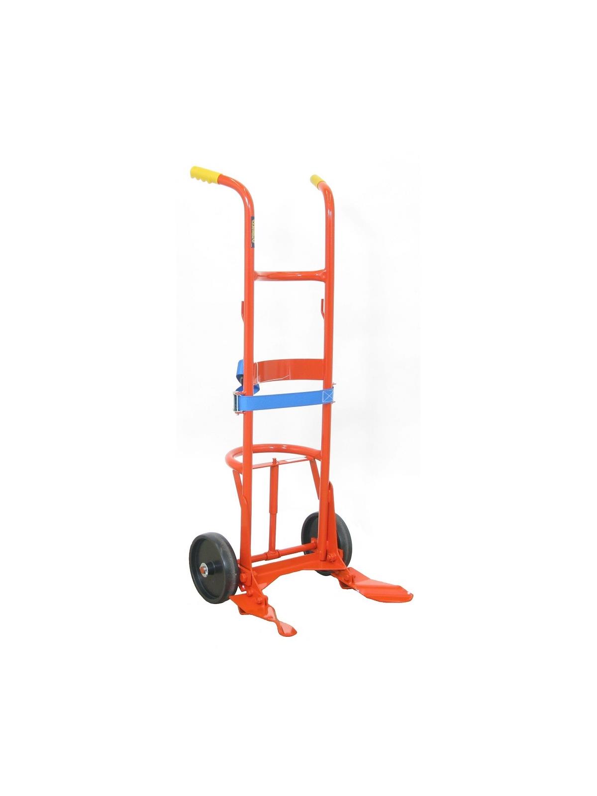 A) Standard Poly Drum Truck Handles all poly and fiber drums except overpacks. Features replaceable "feet" and belt. Wide "feet" and belt eliminate the risk of drums being punctured by nose prongs and chime hooks. Floating axle reduces effort required to break over and balance the load. 23.5"D. Patented design.