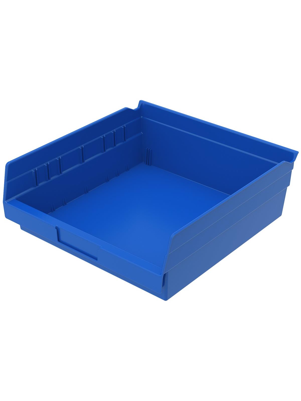 Outlasts corrugated bins - pays for themselves in reduced replacement costs. One-piece construction is waterproof and unaffected by grease or oil. Works with 12", 18" and 24" deep shelving, or vertical storage and retrieval units. Labels available. Available in 22 sizes and five colors - Red, Yellow, Blue, Green, or Semi-Clear. FOB Shipping Point.