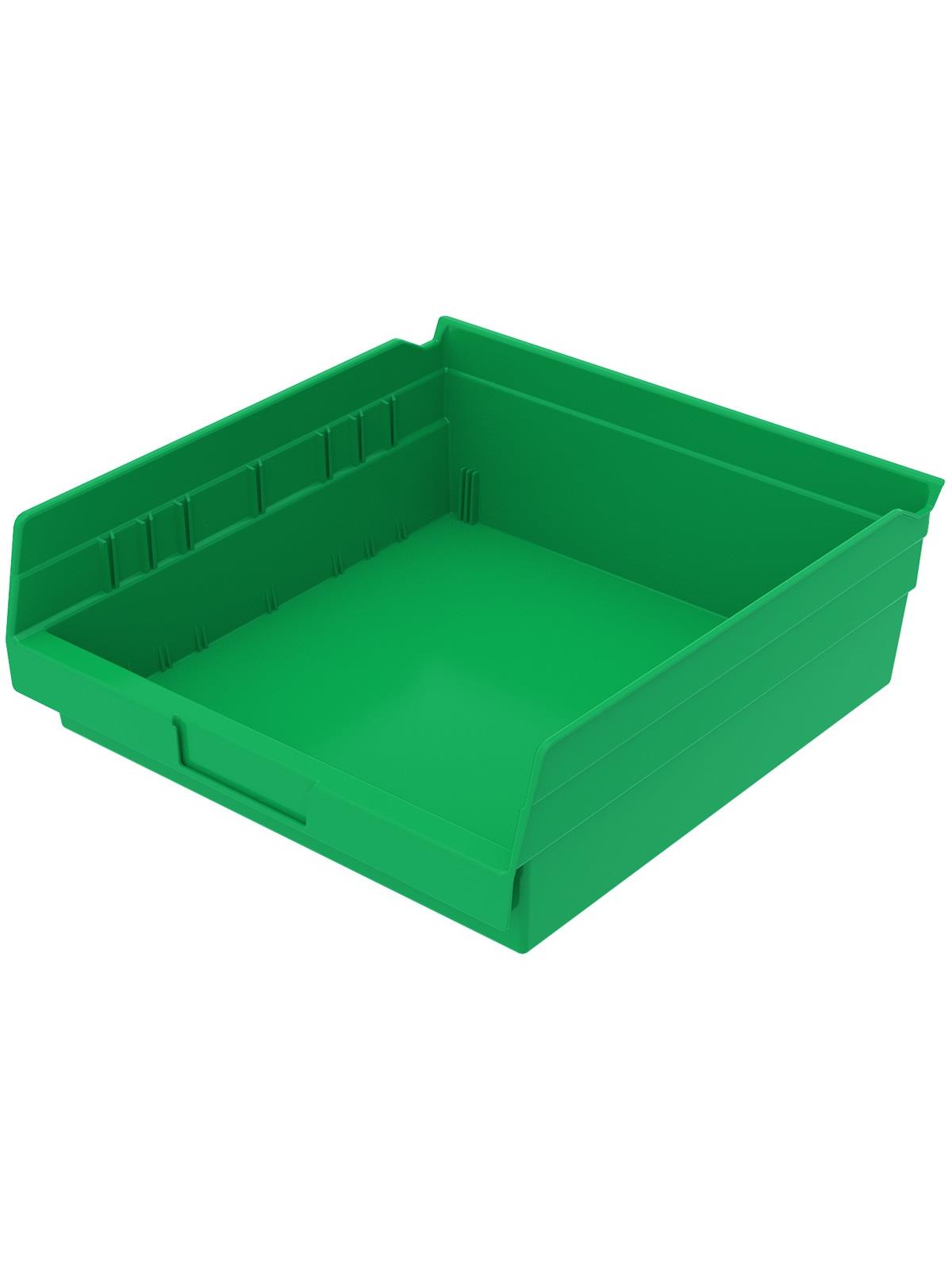 Outlasts corrugated bins - pays for themselves in reduced replacement costs. One-piece construction is waterproof and unaffected by grease or oil. Works with 12", 18" and 24" deep shelving, or vertical storage and retrieval units. Labels available. Available in 22 sizes and five colors - Red, Yellow, Blue, Green, or Semi-Clear. FOB Shipping Point.