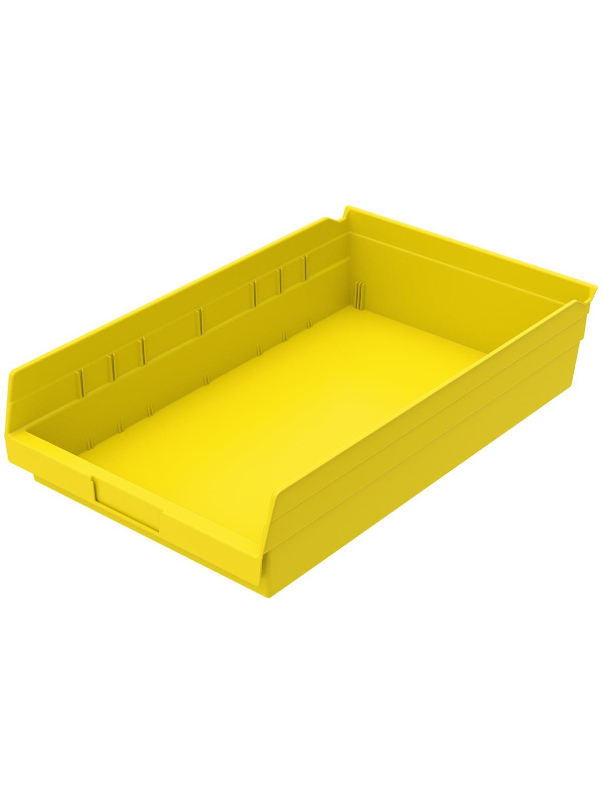 Outlasts corrugated bins - pays for themselves in reduced replacement costs. One-piece construction is waterproof and unaffected by grease or oil. Works with 12", 18" and 24" deep shelving, or vertical storage and retrieval units. Labels available. Available in 22 sizes and five colors - Red, Yellow, Blue, Green, or Semi-Clear. FOB Shipping Point.