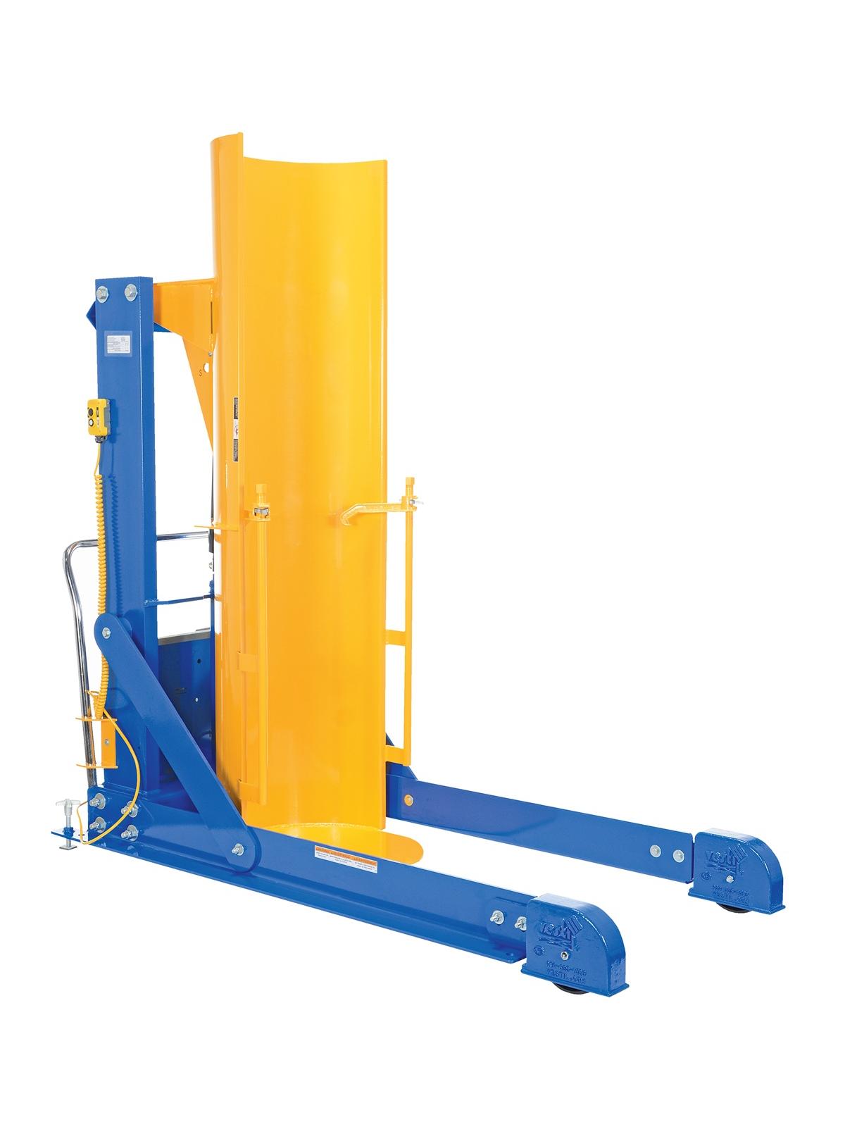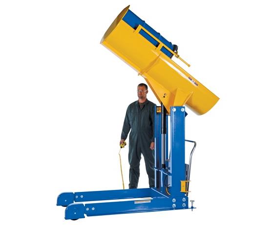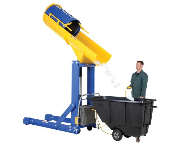 Hydraulic Drum Dumpers work with 30 and 55 gallon plastic, steel, and fiber drums. The unit has a solid steel chute. Portable units have two (2) rigid and two (2) swivel casters with floor lock screws. All steel construction. Standard features include: 56" frame, 3/4" HP motor, 115V single phase, 60hz. Upper travel limit switch, safety velocity fuse in cylinder, and vertical adjustment drum restraints are standard. Dumper is operated with a hand held control on a standard 8 ft. long coil cord. Frame, blue and chute, yellow baked-in powder-coated toughness.
