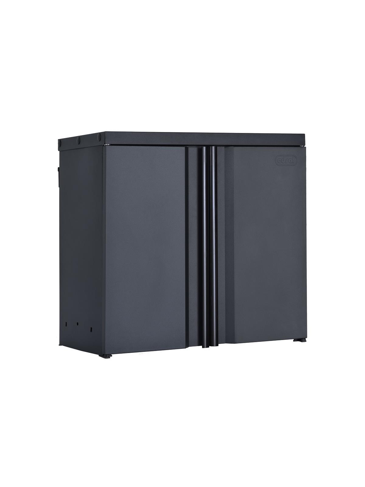 Made of quality aluminum and durable steel structural components. 50% lighter in weight than traditional steel cabinets for ease of assembly and shipping. Bolt-free design for easy assembly in minutes. 300 lb. capacity shelves of evenly distributed weight on tall cabinet; wall cabinet has 150 lb. shelf capacity. Tall cabinet has two fixed shelves plus two adjustable height shelves to accommodate various size items; wall cabinet has one adjustable shelf and one bottom fixed shelf. Modern recessed pull handles. Rubber grommet access holes allow cords through for charging. Adjustable foot levelers on tall cabinet to keep leveled on uneven surfaces. Door magnets keep door closed. Durable black textured finish. Mounting hardware included for wall cabinet. FOB Shipping Point.