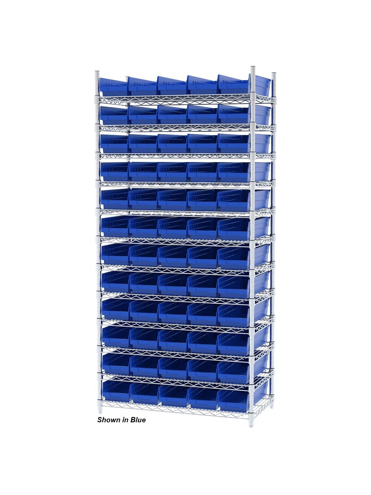 Shelf Bin Wire Systems can be configured for use with 36, 48, 60 or 96 bins providing a versatile system for storage and material handling. Durable and strong polypropylene shelf bins outlast corrugated bins. Bins available in Blue, Red, Yellow, or Semi-Clear. FOB Shipping Point.