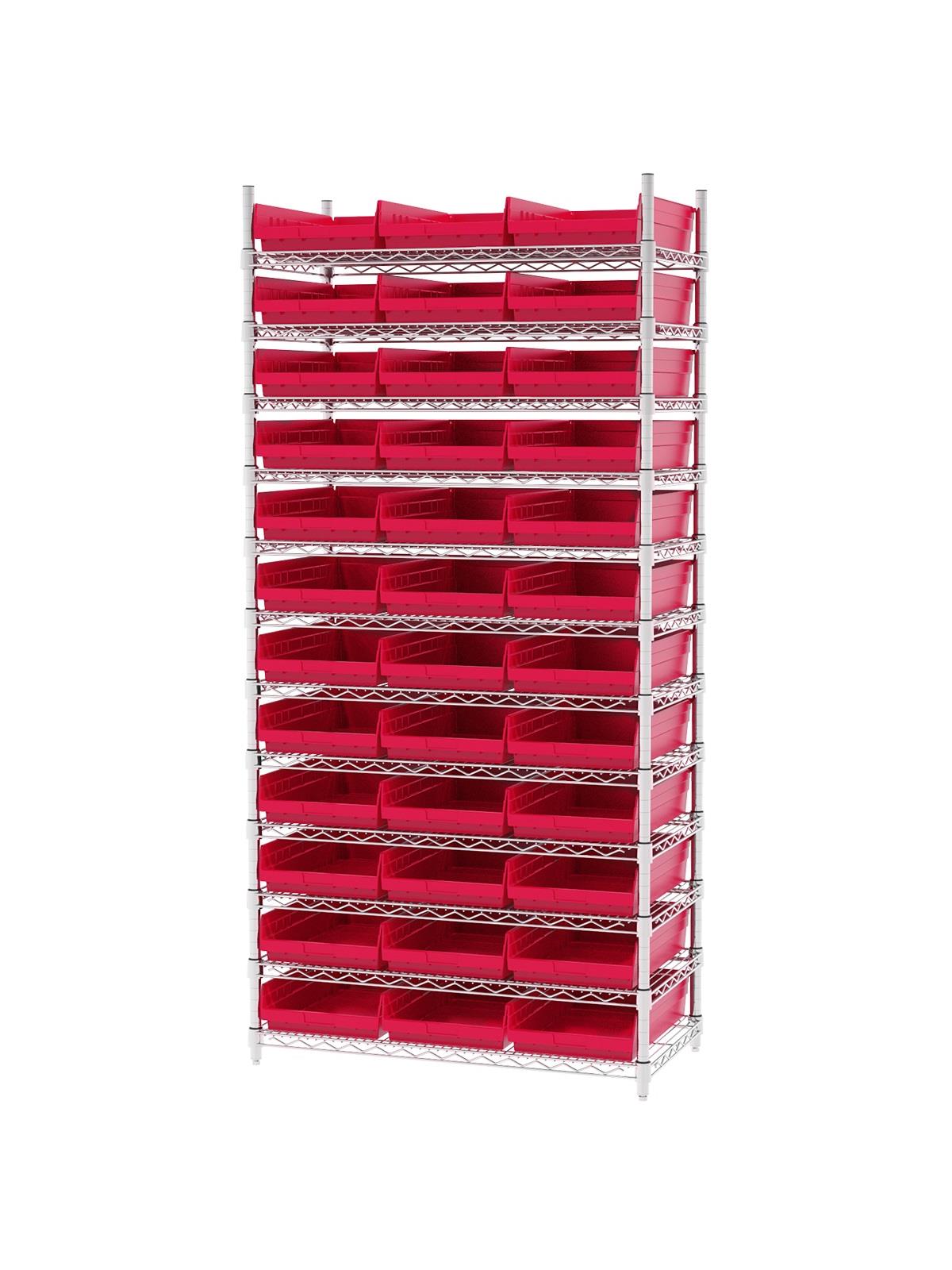 Shelf Bin Wire Systems can be configured for use with 36, 48, 60 or 96 bins providing a versatile system for storage and material handling. Durable and strong polypropylene shelf bins outlast corrugated bins. Bins available in Blue, Red, Yellow, or Semi-Clear. FOB Shipping Point.