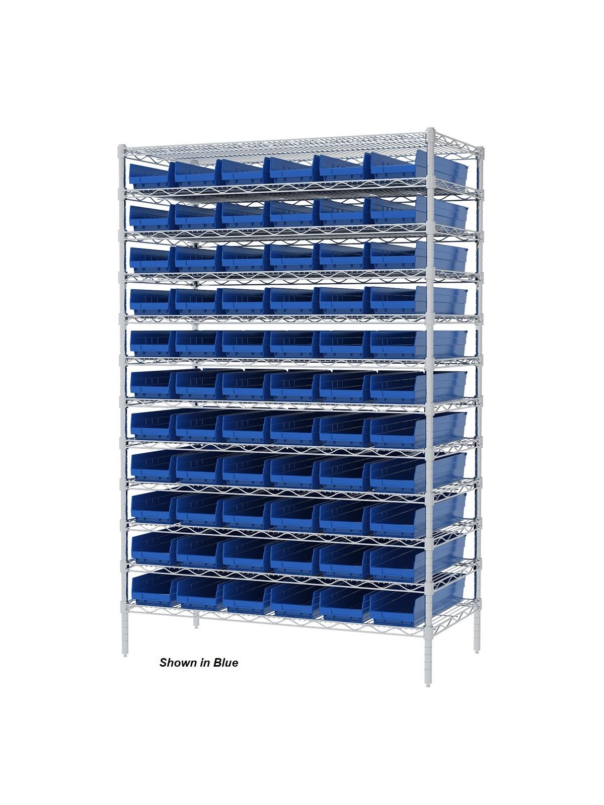 Shelf Bin Wire Systems can be configured for use with 36, 48, 60 or 96 bins providing a versatile system for storage and material handling. Durable and strong polypropylene shelf bins outlast corrugated bins. Bins available in Blue, Red, Yellow, or Semi-Clear. FOB Shipping Point.