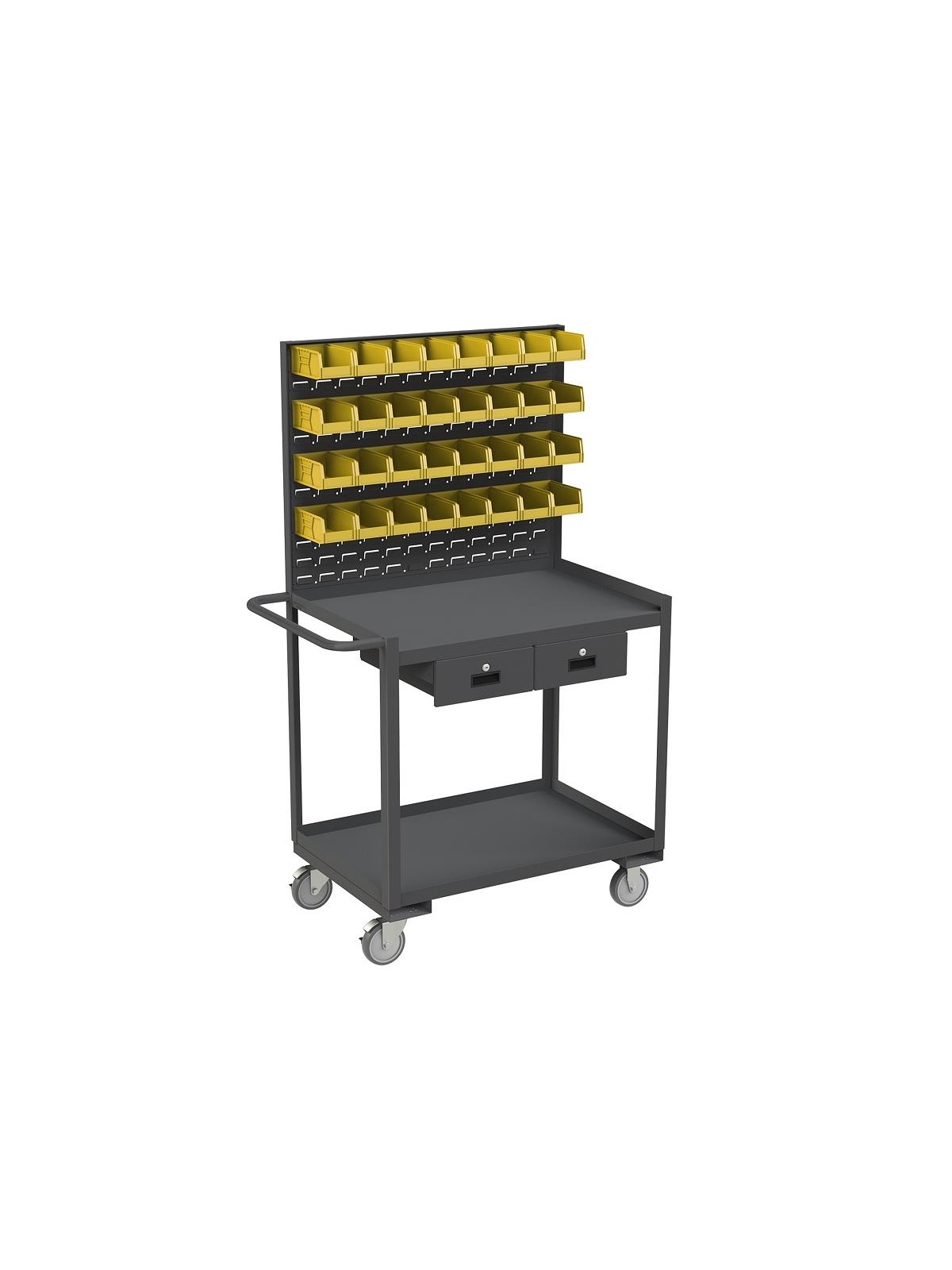 Frame is 1-1/2 x 1/8" angle iron for added strength. Rolls smoothly on 5" polyurethane bolt-on casters, (2) swivel with side brakes and (2) rigid. 1200 lbs. capacity. Pegboard holes are 1/4" diameter and punched on 1" centers. They accommodate standard peg hooks. (peg hooks are not included.) Louvered panels accommodate Hook-On-Bins®. 32 Hook-On-Bins® are included. Bin size is 4" x 7" x 3". Locking drawers, include locks and 2 keys. FOB Shipping Point.