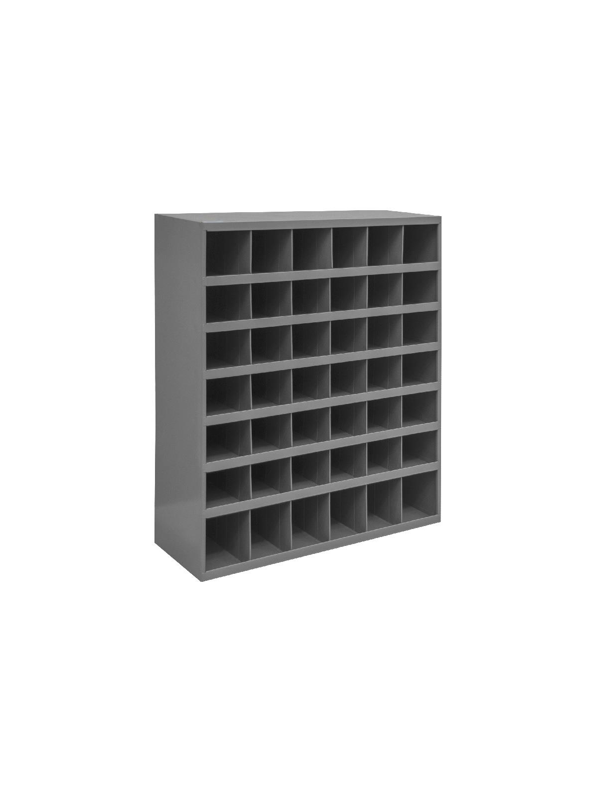 Roll-formed sides for increased strength and stability. Newly redesigned slope shelves. Ribbed and hemmed dividers provide added strength. Optional base available. Ships fully assembled ready for use. Durable gray powder coat finish. FOB Shipping Point.
