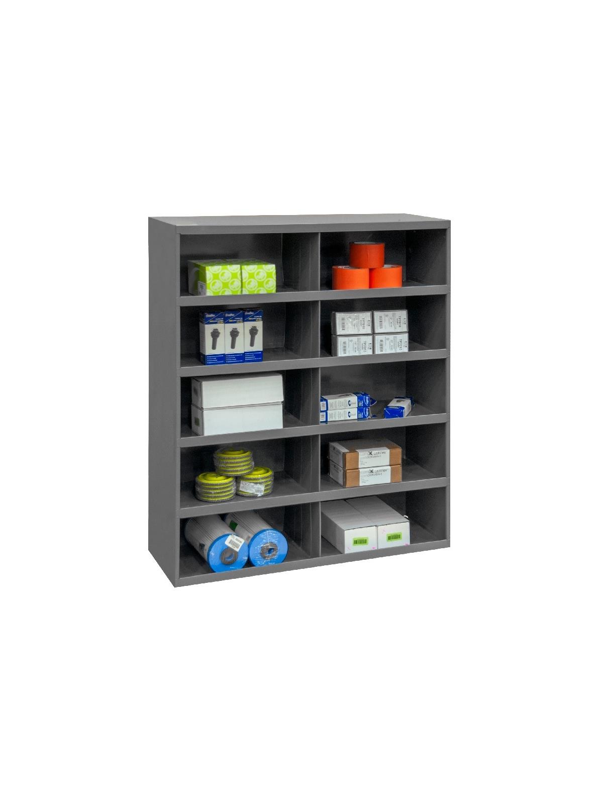 Roll-formed sides for increased strength and stability. Newly redesigned slope shelves. Ribbed and hemmed dividers provide added strength. Optional base available. Ships fully assembled ready for use. Durable gray powder coat finish. FOB Shipping Point.