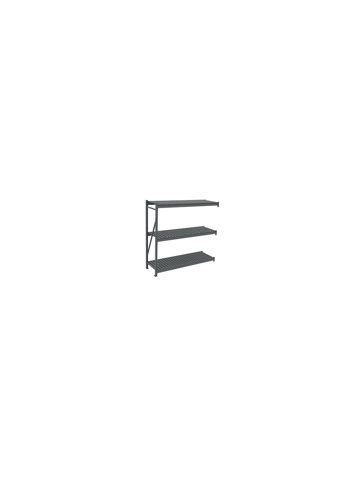 Features adjustable shelves on 2" increments for maximum use of vertical space. Assembly is quick and easy -- beams attach to the frames in seconds without tools. Rolled formed steel beams provide support at front and rear of shelf edges. Additional support is provided by front-to-back center braces. Racks are available in heights of 72", 96" and 120"; widths of 48", 72" and 96" and depths of 24", 36" and 48". Select particleboard decking or corrugated steel decking. Starter units and add-on units have 3 shelf levels.  Additional shelf levels are available to increase capacity. Begin each row of shelving with a starter and use add-on units to complete row. Medium Gray powder-coated paint finish. Note -- bulk storage racks should be hand loaded only. FOB Shipping Point.