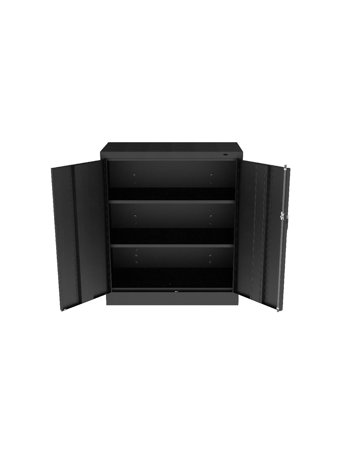 Knuckle hinges on each door insure the integrity of the cabinet and the alignment of the doors. Doors are reinforced for strength and quietness. Handle on right-hand door activates a 3-point system for added security; dummy handle on left-hand door. Shelves are adjustable in 2" increments on built-in shelf tabs. Shelves will hold up to 200 lbs. evenly distributed. Two front leveling glides compensate for uneven floors. Louvered back panel allows air circulation in the cabinet. Available in four models--storage, wardrobe, combination, and counter high cabinets. Available in Black, Champagne/Putty, Sand, Light Gray and Medium Gray. FOB Shipping Point.