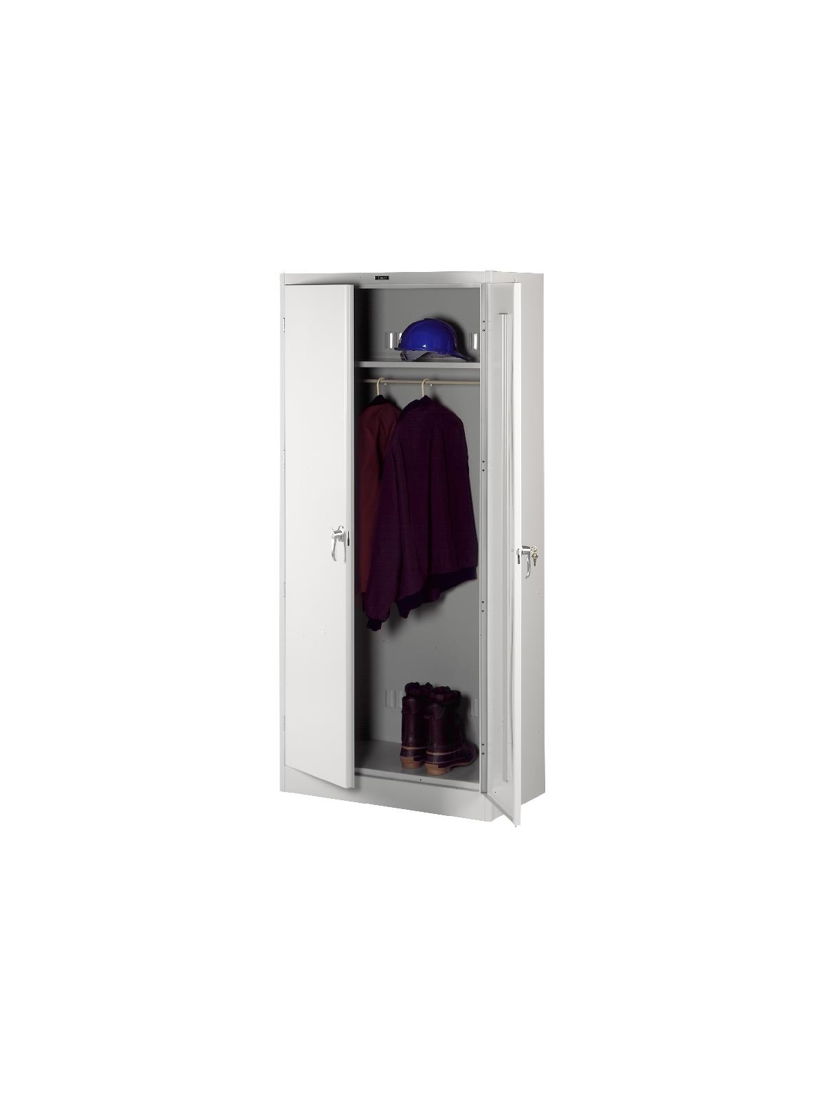 Knuckle hinges on each door insure the integrity of the cabinet and the alignment of the doors. Doors are reinforced for strength and quietness. Handle on right-hand door activates a 3-point system for added security; dummy handle on left-hand door. Shelves are adjustable in 2" increments on built-in shelf tabs. Shelves will hold up to 200 lbs. evenly distributed. Two front leveling glides compensate for uneven floors. Louvered back panel allows air circulation in the cabinet. Available in four models--storage, wardrobe, combination, and counter high cabinets. Available in Black, Champagne/Putty, Sand, Light Gray and Medium Gray. FOB Shipping Point.