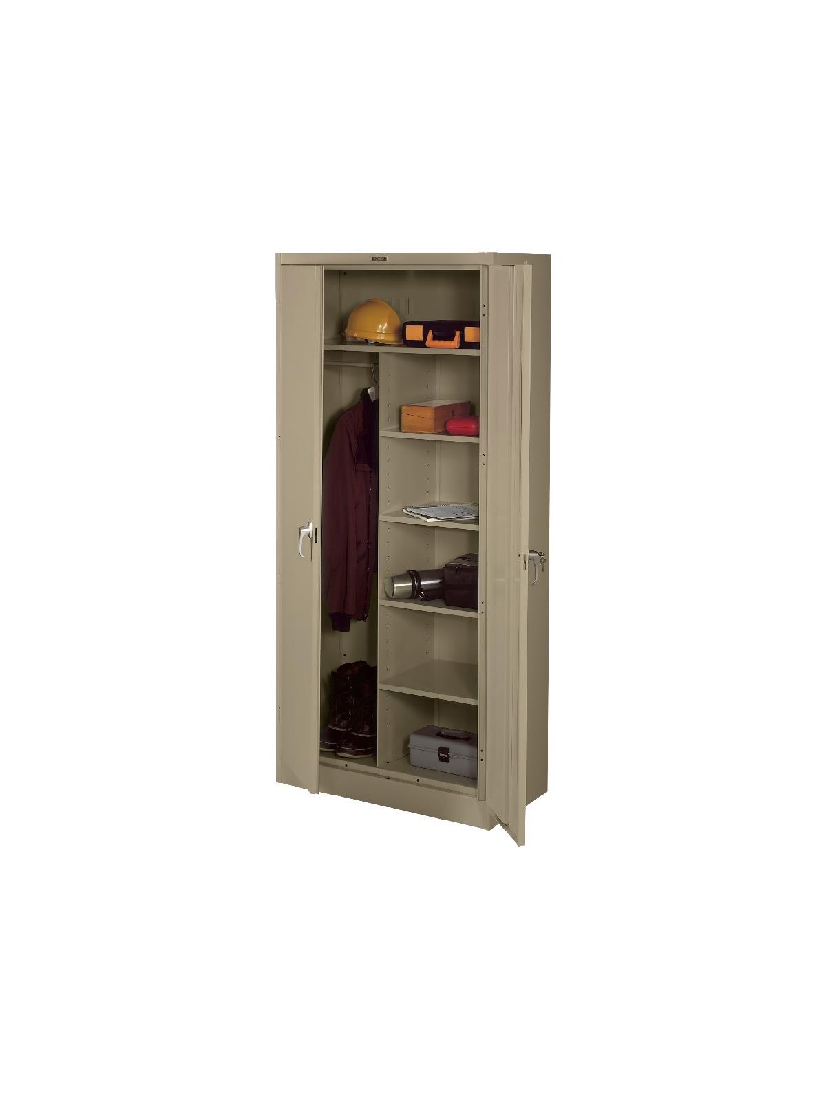 Knuckle hinges on each door insure the integrity of the cabinet and the alignment of the doors. Doors are reinforced for strength and quietness. Handle on right-hand door activates a 3-point system for added security; dummy handle on left-hand door. Shelves are adjustable in 2" increments on built-in shelf tabs. Shelves will hold up to 200 lbs. evenly distributed. Two front leveling glides compensate for uneven floors. Louvered back panel allows air circulation in the cabinet. Available in four models--storage, wardrobe, combination, and counter high cabinets. Available in Black, Champagne/Putty, Sand, Light Gray and Medium Gray. FOB Shipping Point.