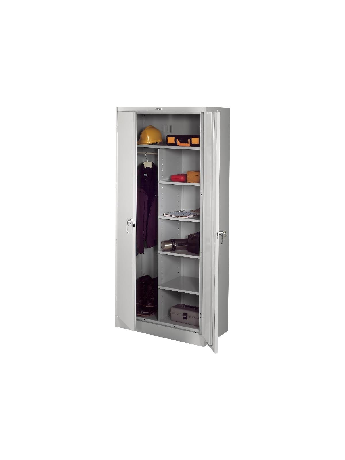 Knuckle hinges on each door insure the integrity of the cabinet and the alignment of the doors. Doors are reinforced for strength and quietness. Handle on right-hand door activates a 3-point system for added security; dummy handle on left-hand door. Shelves are adjustable in 2" increments on built-in shelf tabs. Shelves will hold up to 200 lbs. evenly distributed. Two front leveling glides compensate for uneven floors. Louvered back panel allows air circulation in the cabinet. Available in four models--storage, wardrobe, combination, and counter high cabinets. Available in Black, Champagne/Putty, Sand, Light Gray and Medium Gray. FOB Shipping Point.
