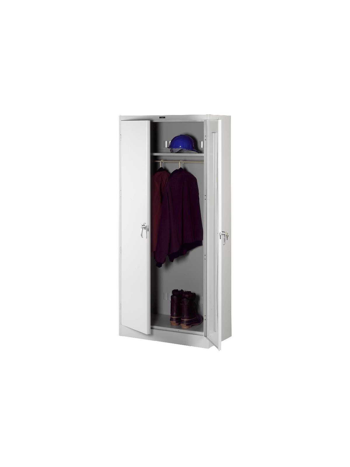 Knuckle hinges on each door insure the integrity of the cabinet and the alignment of the doors. Doors are reinforced for strength and quietness. Handle on right-hand door activates a 3-point system for added security; dummy handle on left-hand door. Shelves are adjustable in 2" increments on built-in shelf tabs. Shelves will hold up to 200 lbs. evenly distributed. Two front leveling glides compensate for uneven floors. Louvered back panel allows air circulation in the cabinet. Available in four models--storage, wardrobe, combination, and counter high cabinets. Available in Black, Champagne/Putty, Sand, Light Gray and Medium Gray. FOB Shipping Point.