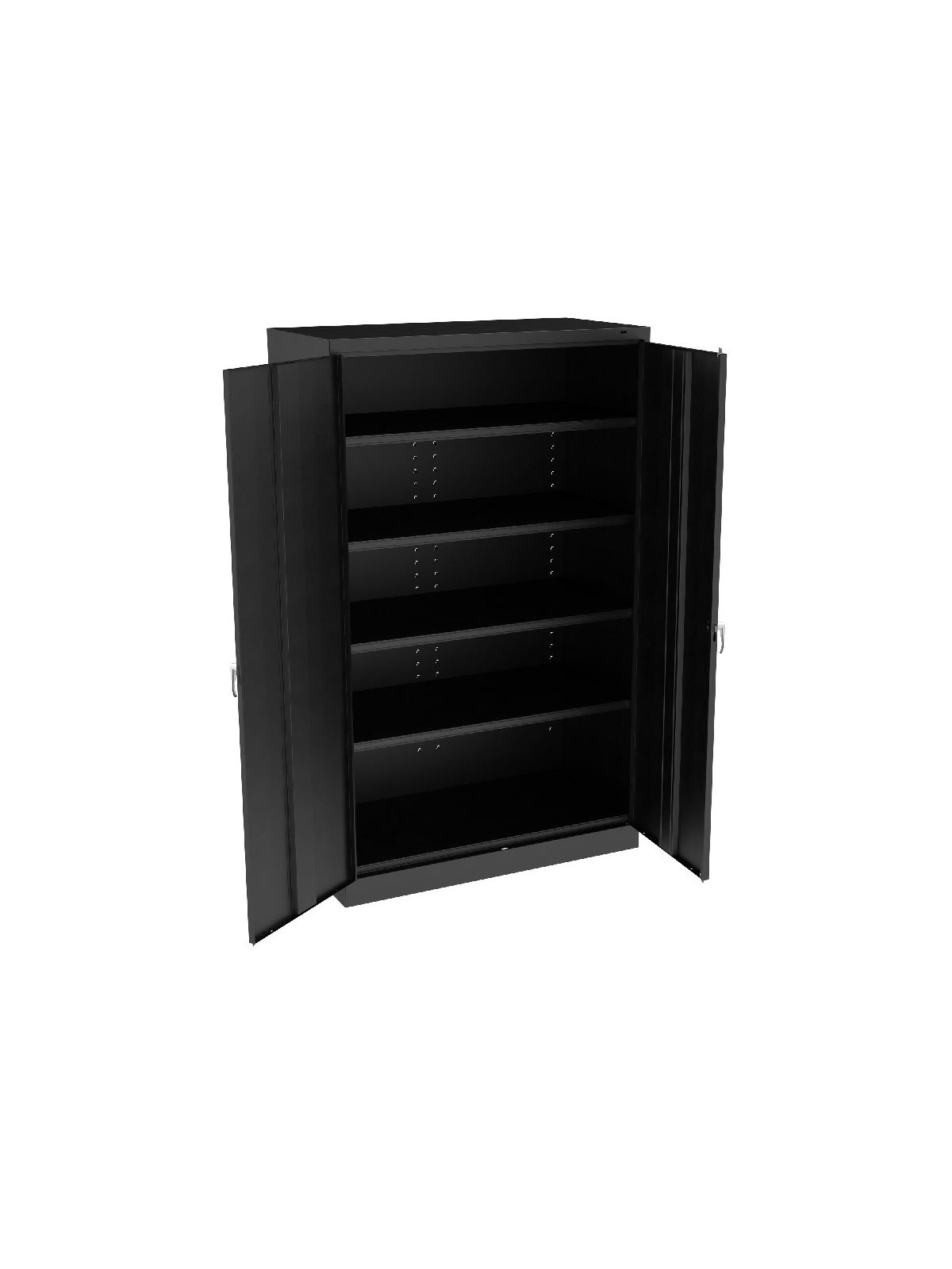 Jumbo size for jumbo storage capacity. Two front leveling glides compensate for uneven floors. Four leaf hinges on each door insure the integrity of the cabinet and the alignment of the doors. Handle on right-hand door activates a three-point locking system for added security -- second handle on left-hand door. Shelves are adjustable in 2" increments on built-in shelf tabs. Shelves hold up to 400 lbs. evenly distributed. Unassembled cabinets ship in 2 cartons. Available in Black, Champagne/Putty, Sand, Light Gray and Medium Gray. FOB Shipping Point.