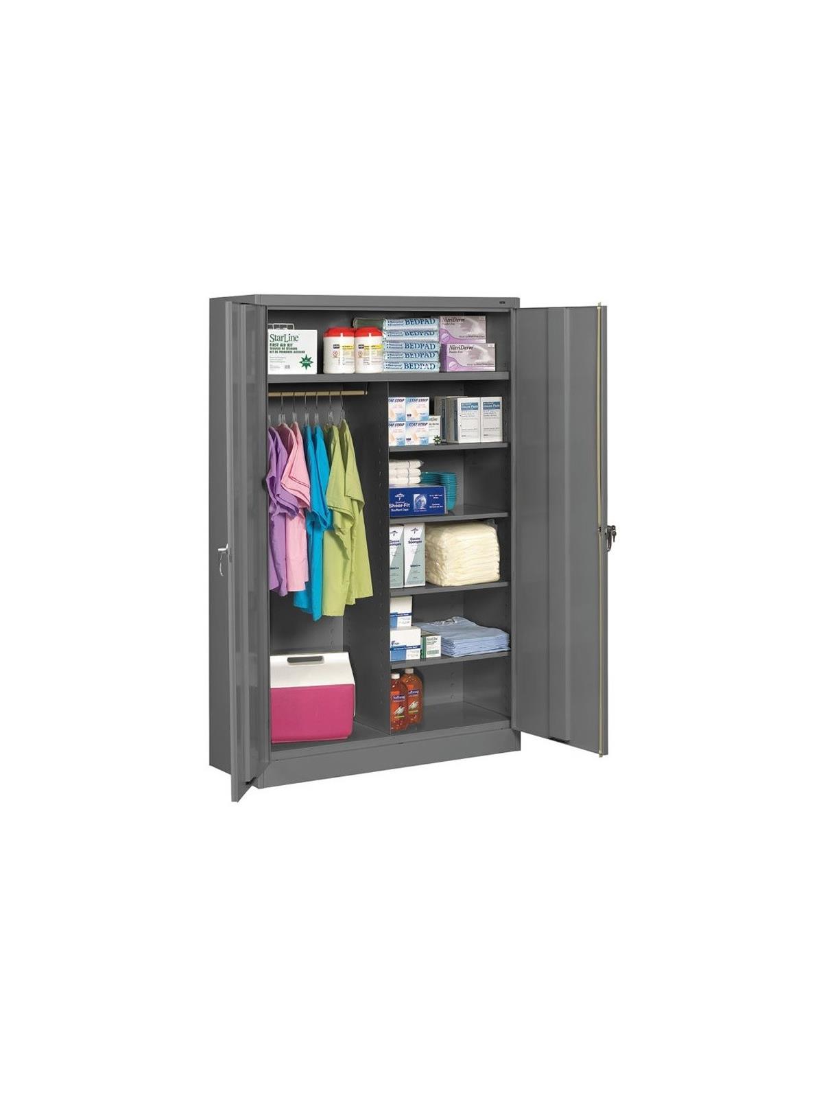 Jumbo size for jumbo storage capacity. Two front leveling glides compensate for uneven floors. Four leaf hinges on each door insure the integrity of the cabinet and the alignment of the doors. Handle on right-hand door activates a three-point locking system for added security -- second handle on left-hand door. Shelves are adjustable in 2" increments on built-in shelf tabs. Shelves hold up to 400 lbs. evenly distributed. Unassembled cabinets ship in 2 cartons. Available in Black, Champagne/Putty, Sand, Light Gray and Medium Gray. FOB Shipping Point.