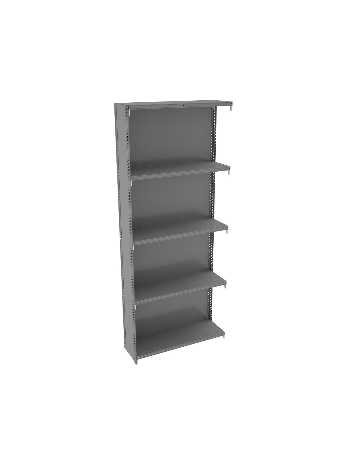 The unique shelf design has deep box-beam formations front and back, fully lapped and welded corners and double-ribbed outside surfaces on the box formation. In addition, the front and rear flange on the box beam is welded every 3". The result is load capacities that range all the way up to 1000 lbs. Shelves can be adjusted quickly and easily in 1" increments to make maximum use of vertical space. Five shelves including top and bottom shelves. Choose from open or closed units. Additional shelves are available as well as adjustable shelf dividers, shelf boxes and doors. Starter unit can be used individually or combined with adder units to form a row of shelving. Shipped unassembled. Medium gray finish. FOB Shipping Point.