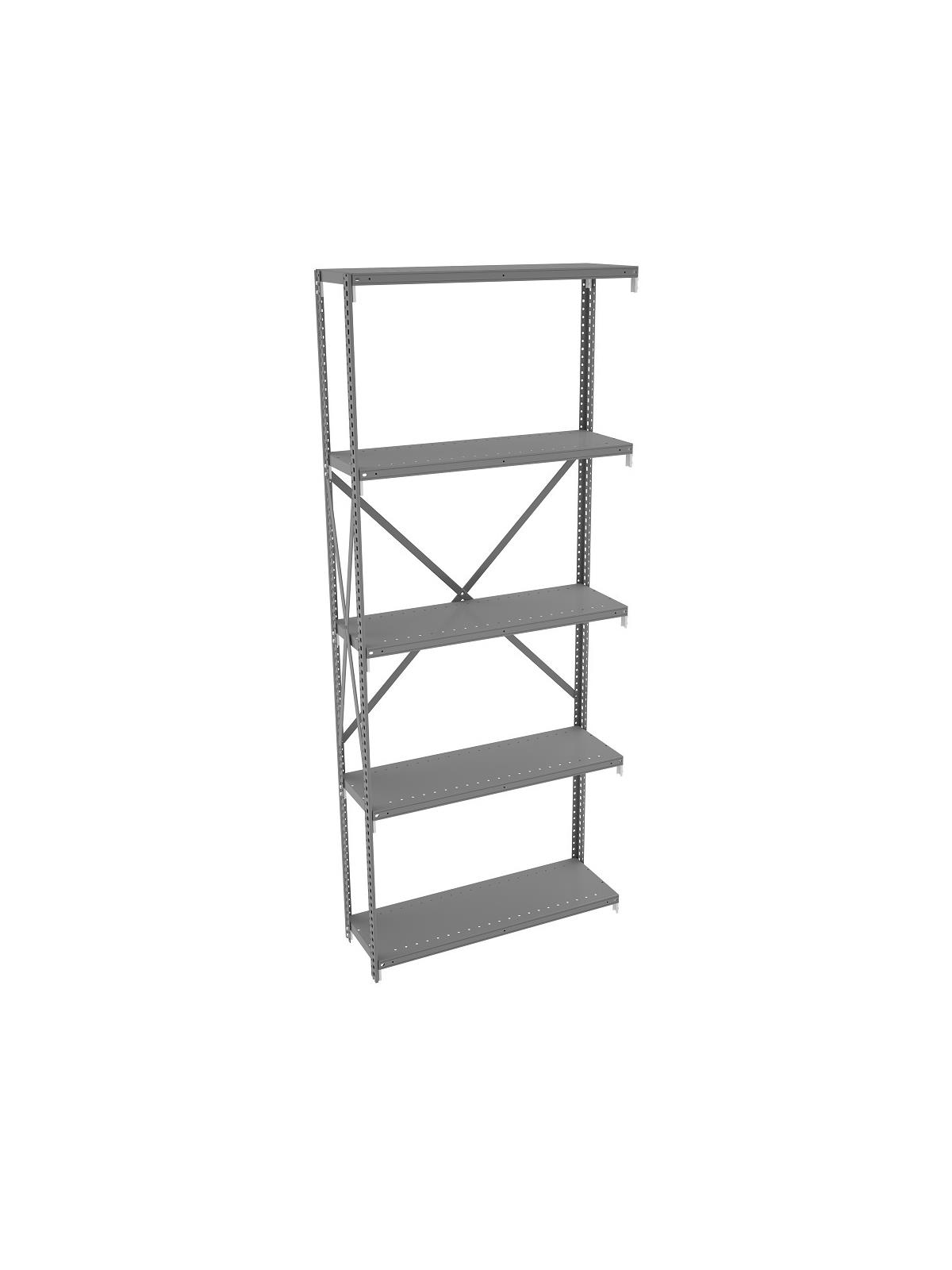 The unique shelf design has deep box-beam formations front and back, fully lapped and welded corners and double-ribbed outside surfaces on the box formation. In addition, the front and rear flange on the box beam is welded every 3". The result is load capacities that range all the way up to 1000 lbs. Shelves can be adjusted quickly and easily in 1" increments to make maximum use of vertical space. Five shelves including top and bottom shelves. Choose from open or closed units. Additional shelves are available as well as adjustable shelf dividers, shelf boxes and doors. Starter unit can be used individually or combined with adder units to form a row of shelving. Shipped unassembled. Medium gray finish. FOB Shipping Point.