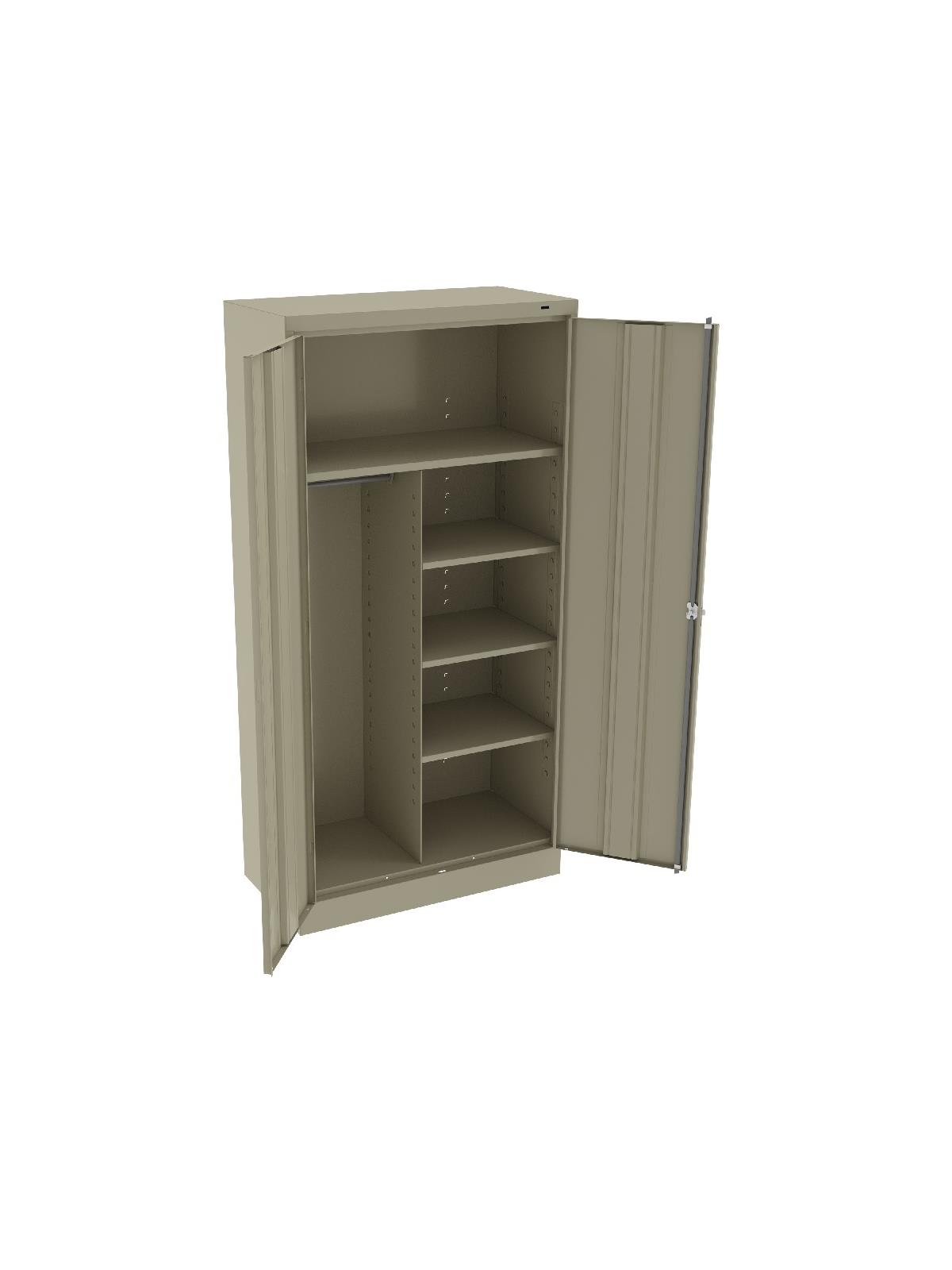Shelves adjust in 2" increments. Heavy-steel construction with leaf hinges and reinforced doors stand up to a lifetime of heavy use. Handle on right-hand door activates the three-point locking system to keep belongings secure. Raised base keeps contents from contacting moisture from the floor. Available in 3 models--storage, wardrobe and combination. Available in Black, Champagne/Putty, Sand, Light Gray and Medium Gray. FOB Shipping Point.
