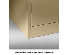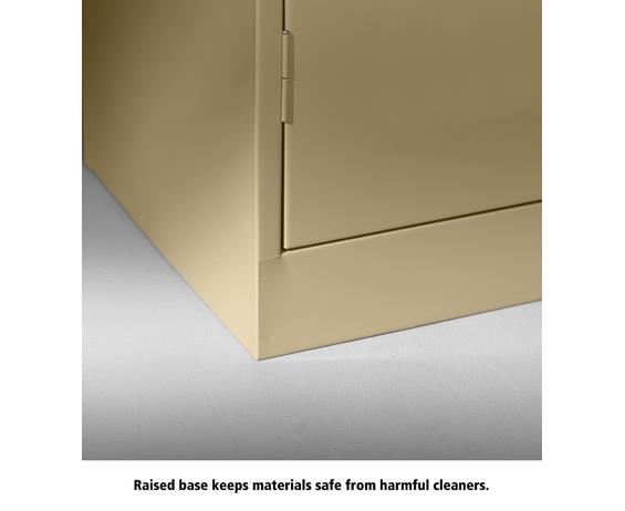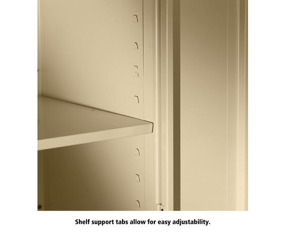 Shelves adjust in 2" increments. Heavy-steel construction with leaf hinges and reinforced doors stand up to a lifetime of heavy use. Handle on right-hand door activates the three-point locking system to keep belongings secure. Raised base keeps contents from contacting moisture from the floor. Available in Black, Champagne/Putty (shown), Sand, Light Gray and Medium Gray (shown). FOB Shipping Point.