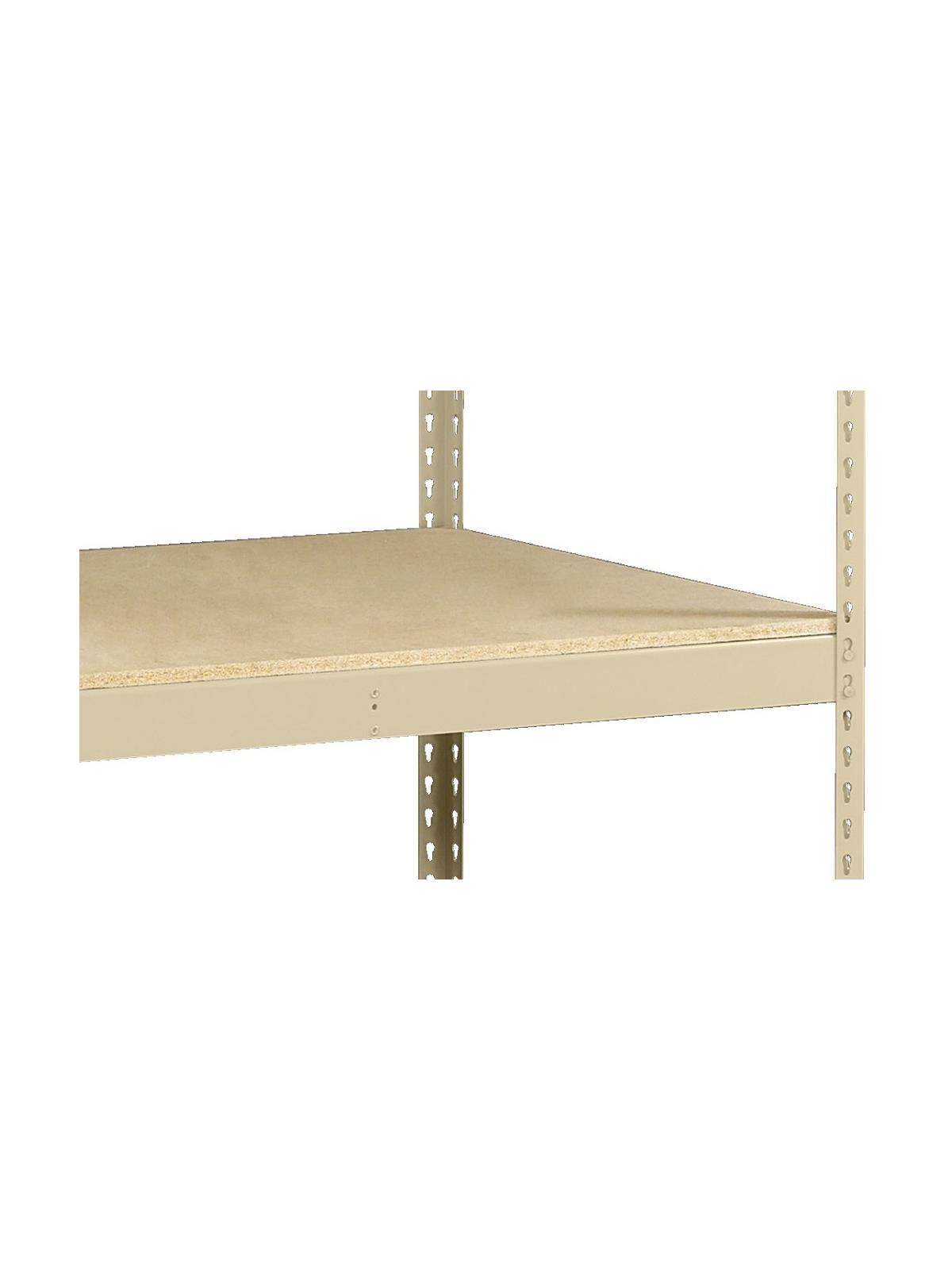 Built with double-rivet design and keyhole slots to form a rigid framework. Heavy 14 gauge steel posts and shelf supports deliver a system that stands up to rugged use. Assembles easily and quickly with only a rubber mallet. The rivet and keyhole design eliminates the need for clips, gussets, or sway braces and allows access to the shelves from all sides of the unit. Wide profile 2-3/4"H angle shelf supports handle loads from 1600-2250 lbs. per shelf, depending on shelf size. Shelves are supported on all 4 sides in addition to having front-to-back center supports. The units have 3 shelf levels (2 openings). Buy the unit with 5/8" particle board decking. Available in Sand or Medium Gray, specify in comments when ordering. FOB Shipping Point.