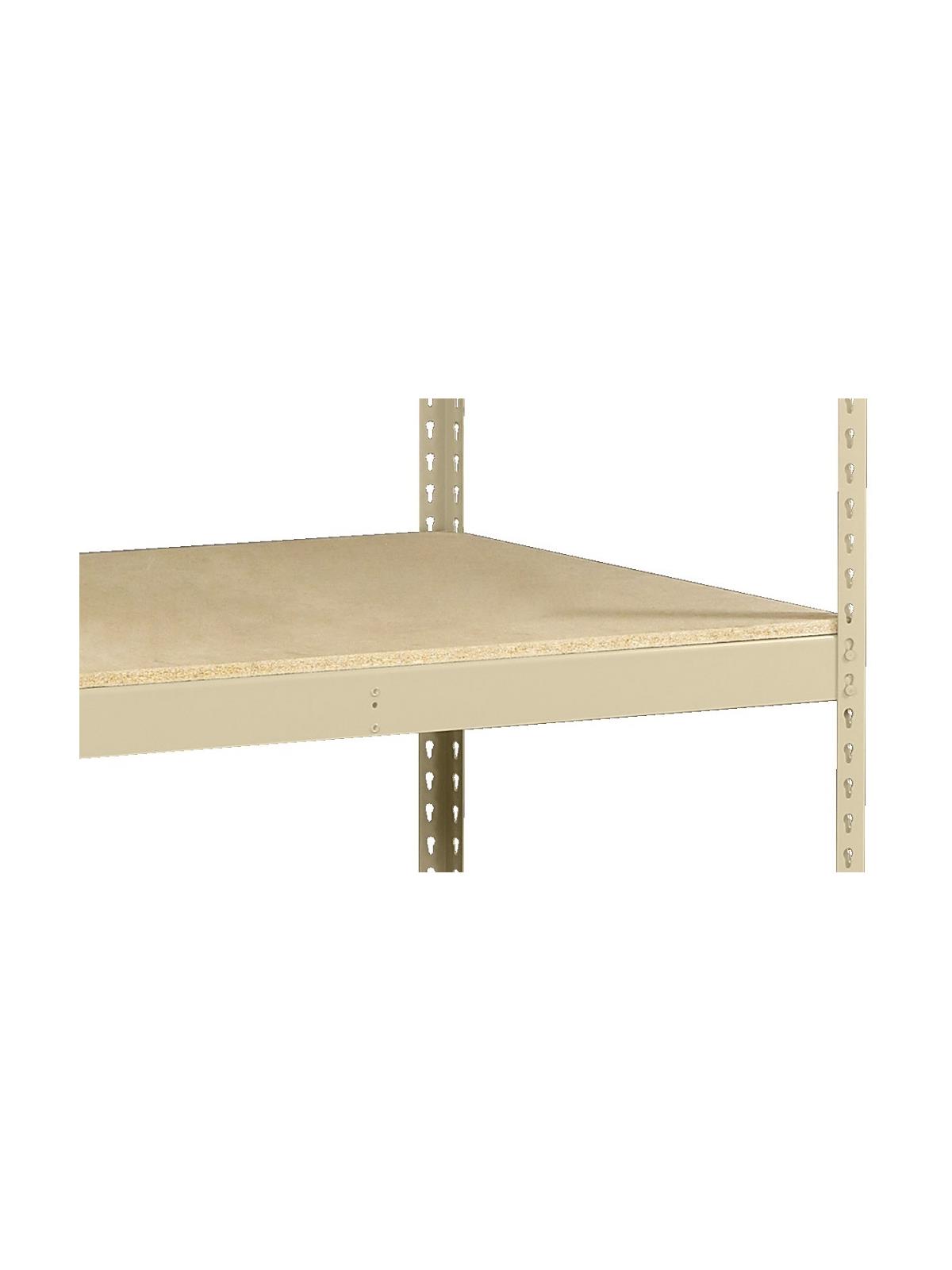 Built with double-rivet design and keyhole slots to form a rigid framework. Heavy 14 gauge steel posts and shelf supports deliver a system that stands up to rugged use. Assembles easily and quickly with only a rubber mallet. The rivet and keyhole design eliminates the need for clips, gussets, or sway braces and allows access to the shelves from all sides of the unit. Wide profile 2-3/4"H angle shelf supports handle loads from 1600-2250 lbs. per shelf, depending on shelf size. Shelves are supported on all 4 sides in addition to having front-to-back center supports. The units have 3 shelf levels (2 openings). Buy the unit with 5/8" particle board decking. Available in Sand or Medium Gray, specify in comments when ordering. FOB Shipping Point.