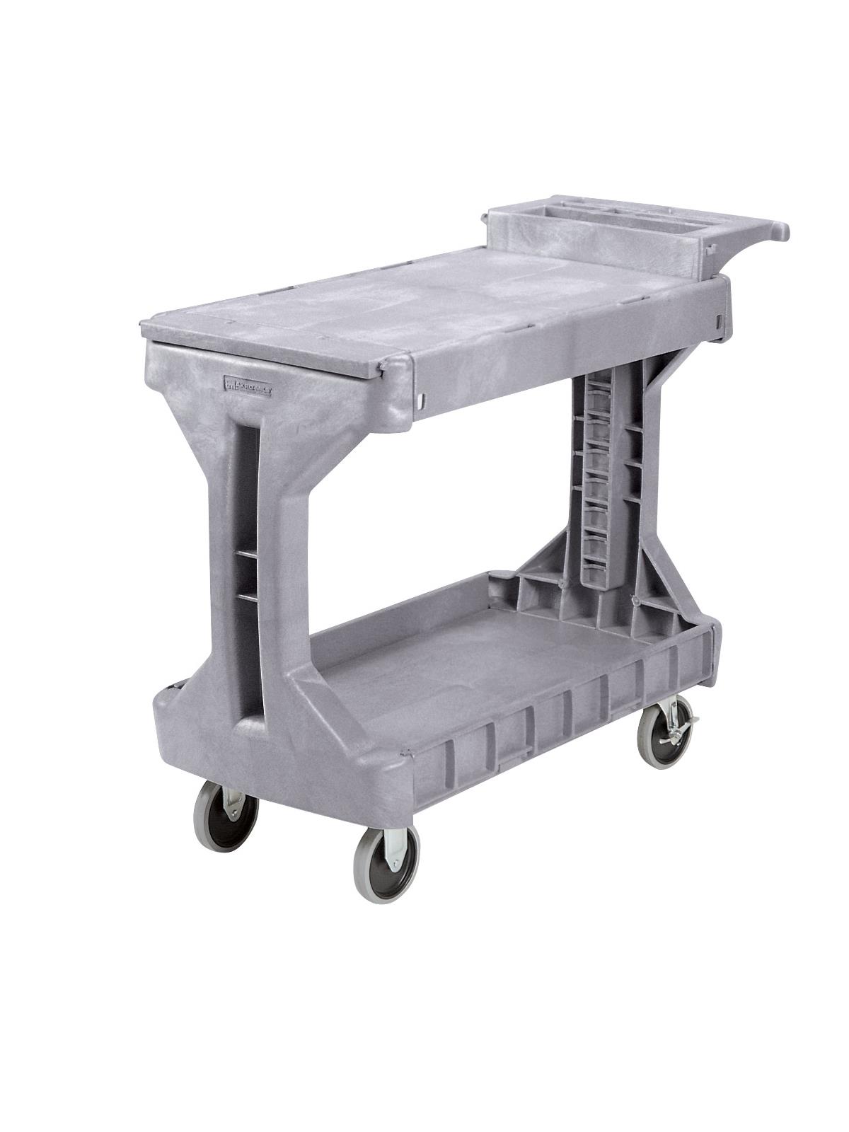 Engineered to adapt to all the ways and the places you work. Quickly converts to a flat-top or a box-top cart with one hand. Hinged side gates on both shelves flip up or down for different cart configurations - no tools necessary. Flat-top for sliding boxes on and off shelves and box-top to secure cartons during transport. Made of high-density polyethylene structural foam - panels are dent-resistant, and rust-proof. Innovative I-beam design allows for easy loading and unloading of oversized boxes on the lower shelf. Rounded corners and edges prevent mishaps. Handles loads up to 400 lbs. Features supply compartments for easy access to small items. Comfortable full-width handle. Easy rolling on durable, non-marking 5" ball bearing wheels - includes rear locking casters. Available in Gray. FOB Shipping Point.