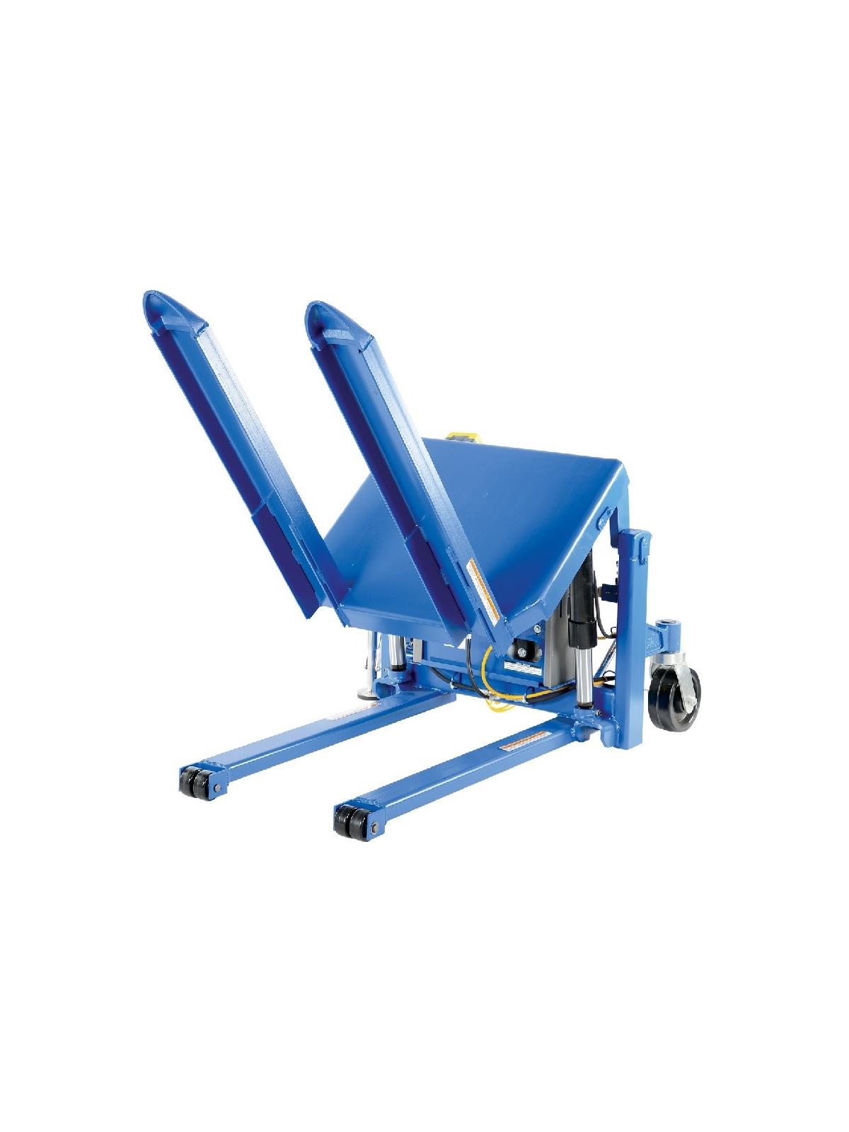 Lift and position filled tote boxes or baskets without the need of a fork truck or lift table using the newly designed heavy-duty Tilt Master. These 90 degree tilters will function as a transporter by moving completed products from work station to work station without waiting for a fork truck. A folding ergonomic handle has dual steering grips for quick and easy maneuverability. Unit has a thin profile to allow the user to get as close to the load as possible. Units roll easily on 8" x 3" phenolic steering wheels and feature a floor lock. Series TM are to be used with open bottom pallets or skids only while the Tilt Master Straddle units, series TMS, can be used with virtually any kind of container or pallet. Units are powered with a 12V DC electric motor including an on-board battery charger standard. AC or *AIR/OIL power units available contact factory (*filter - regulator - lubricator required). Comes standard with a push-button hand control on an 8 foot coil cord. Battery Charge Indicator Gauge now standard. FOB Shipping Point.