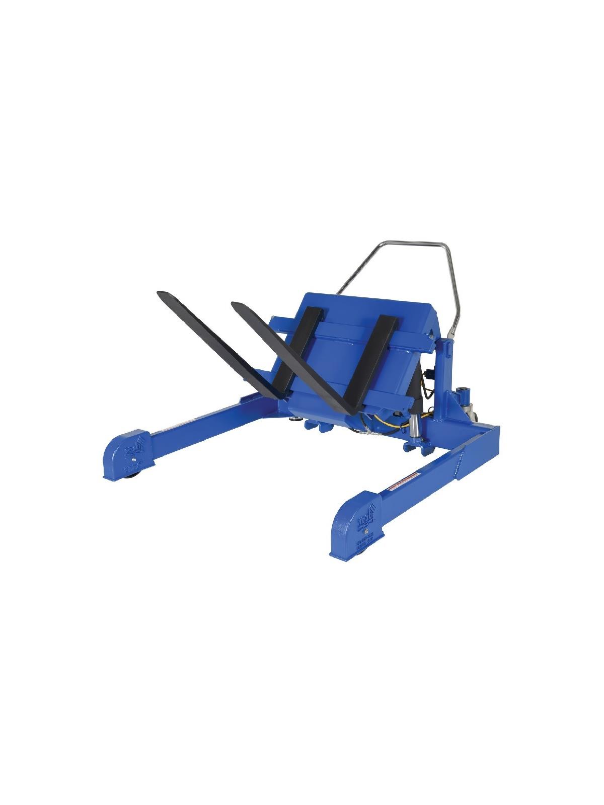 Lift and position filled tote boxes or baskets without the need of a fork truck or lift table using the newly designed heavy-duty Tilt Master. These 90 degree tilters will function as a transporter by moving completed products from work station to work station without waiting for a fork truck. A folding ergonomic handle has dual steering grips for quick and easy maneuverability. Unit has a thin profile to allow the user to get as close to the load as possible. Units roll easily on 8" x 3" phenolic steering wheels and feature a floor lock. Series TM are to be used with open bottom pallets or skids only while the Tilt Master Straddle units, series TMS, can be used with virtually any kind of container or pallet. Units are powered with a 12V DC electric motor including an on-board battery charger standard. AC or *AIR/OIL power units available contact factory (*filter - regulator - lubricator required). Comes standard with a push-button hand control on an 8 foot coil cord. Battery Charge Indicator Gauge now standard. FOB Shipping Point.