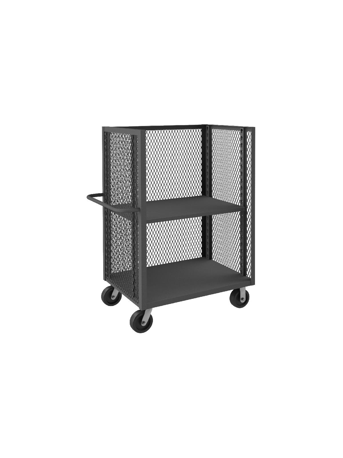 Three sided design keeps contents secure and in place - while allowing easy accessibility. Constructed of 14 ga. cold rolled steel. Expanded metal sides and back. Durable steel construction supports loads up to 2000 lbs. Base has lip-up for product retention. Features convenient push handle. Easy, smooth rolling on 6" x 2" phenolic bolt-on casters - 2 swivel, 2 rigid. Casters are 2,000 lb. capacity. Sides and back extend 48" above deck. Durable Gray powder coat finish. Includes one adjustable shelf. FOB Shipping Point.