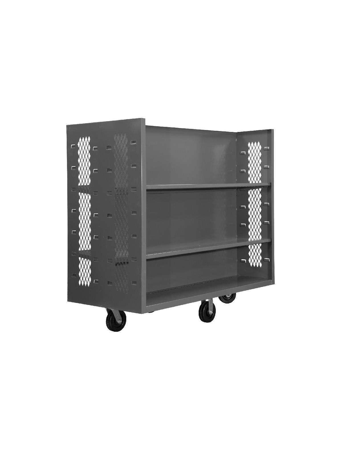 Features 2 sided design for greater efficiency and see-through mesh sides. All units are 48" above the deck. Center panel makes it easy to see on-board items. 2000 lb. model rolls on 6" phenolic casters: 2 rigid, 2 swivel.  Durable Gray powder coat finish. FOB Shipping Point.
