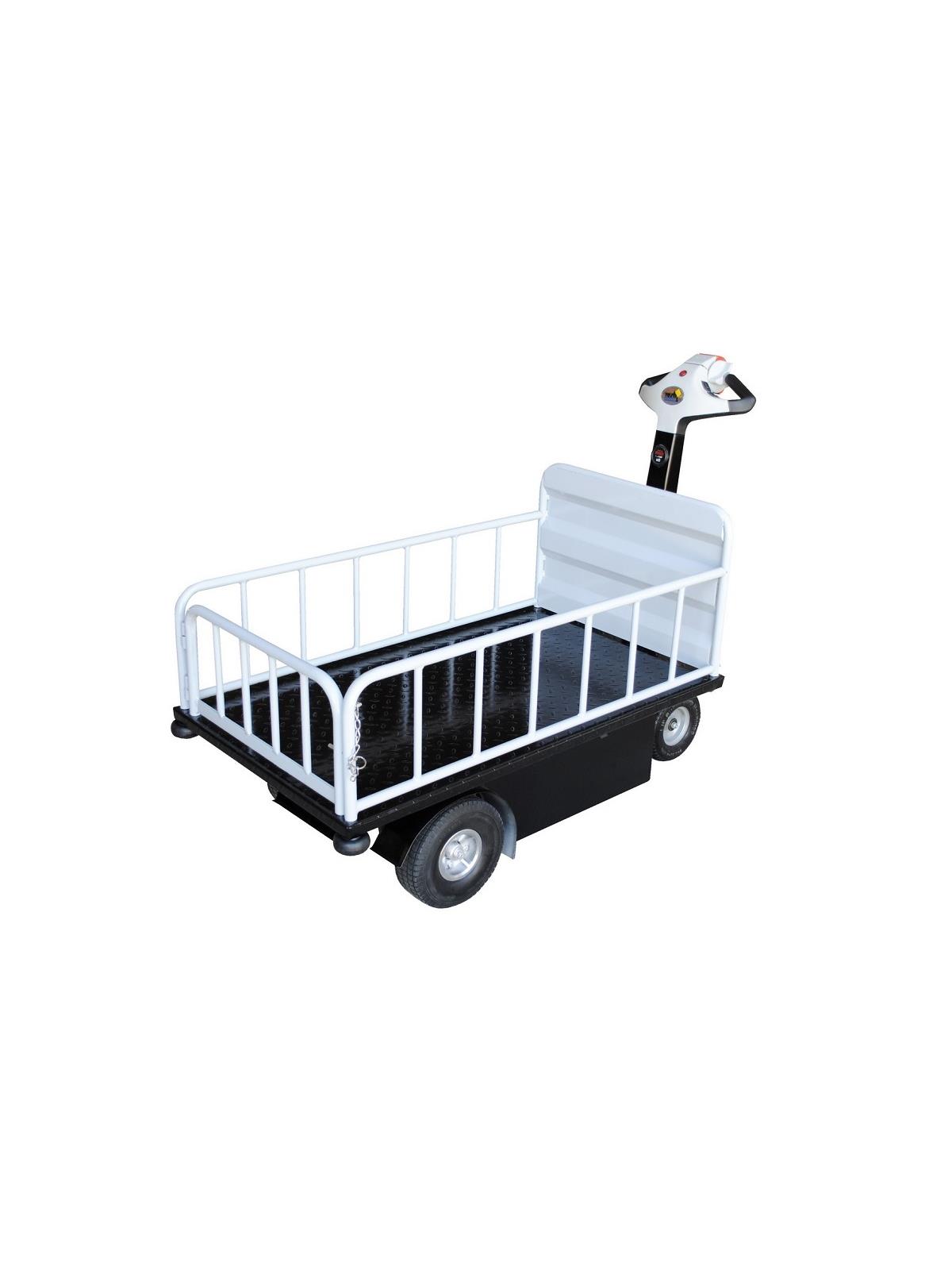 Unique carts feature built-in traction-drive system for easy transportability. Ideal for applications including mail rooms, hospitals, supermarkets, hotels and warehouses. Features 450W electric drive motor with two 12V batteries for power. 110V AC internal battery charger is included along with battery level indicator. Variable throttle speed control for precise maneuvering and positioning is located in the handle. Units roll smoothly on (2) 9" x 3-1/4" solid foam rubber steering wheels and (2) 10" x 3-1/4" solid foam drive wheels. Walking speed is 0-2.8 mph when unloaded and 0-1.5 mph when loaded. Speed control is conveniently located in handle. Handle pivots back towards operator and includes horn and emergency stop. Maximum incline is 7 degrees. Each shelf includes a tread plate surface. Deck height 14". FOB Shipping Point.