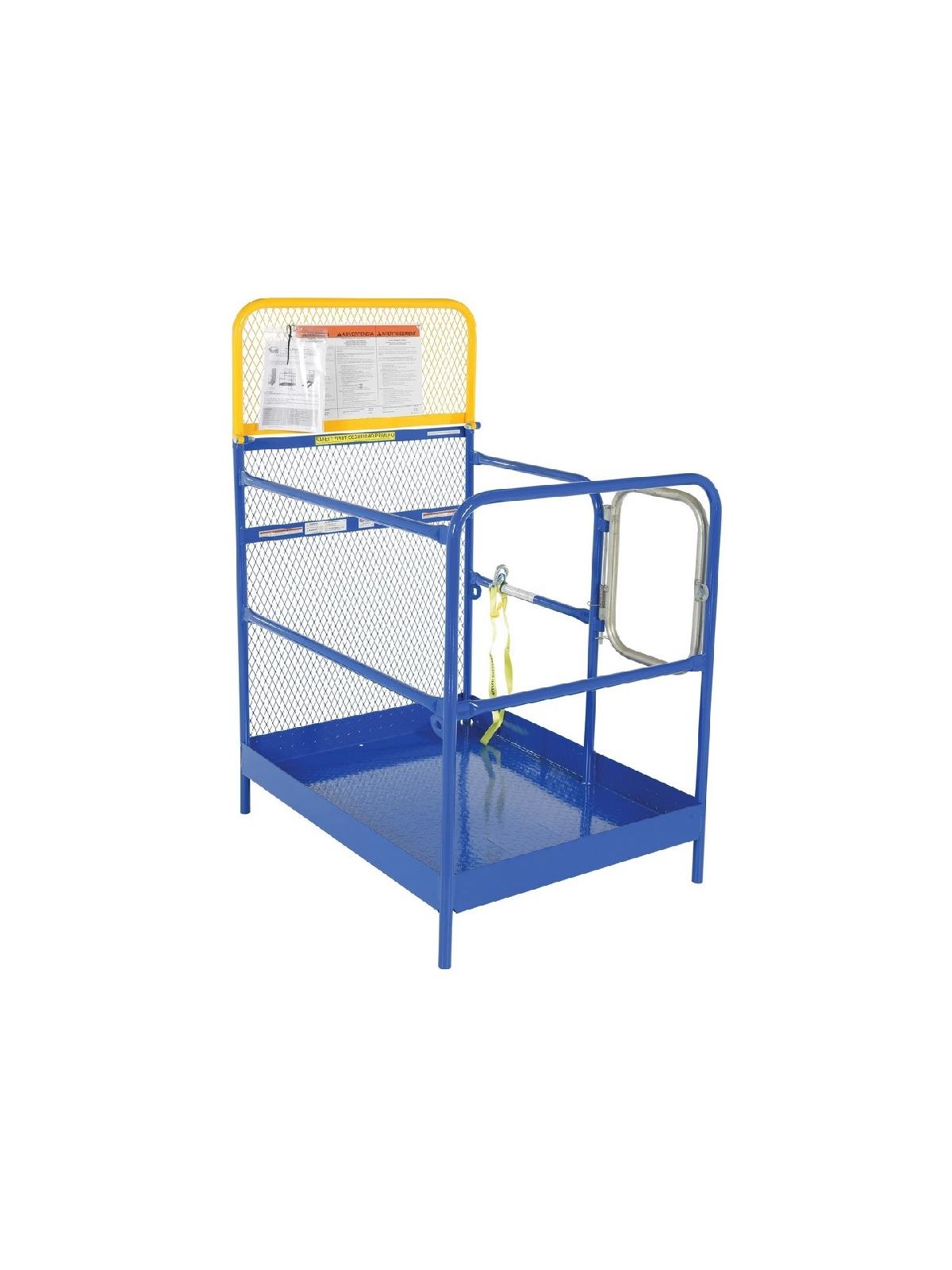 Convenient fork truck work platforms quickly and safely raise maintenance personnel where they are needed. Attaches to fork lift truck by inserting forks into fork pockets and securing platform to fork truck. Fork locks secure platform to forks and a 36" long safety restraint which hook attaches platform to fork truck. 42" high handrail with 21" high mid-rail on three sides. 60" high expanded metal backing on forth side (84" high backing to meet California OSHA available, call for details). Includes diamond plate platform. The usable fork pockets on single and dual side door entry are 7-3/4"W x 3-7/8"H in rear and 7-3/4"W x 1-7/8"H in front. The usable fork pockets on fold down work platform measure 7-7/8"W x 3-3/8"H on 27-3/4" centers. Steel construction with baked-in powder-coated toughness. FOB Shipping Point.