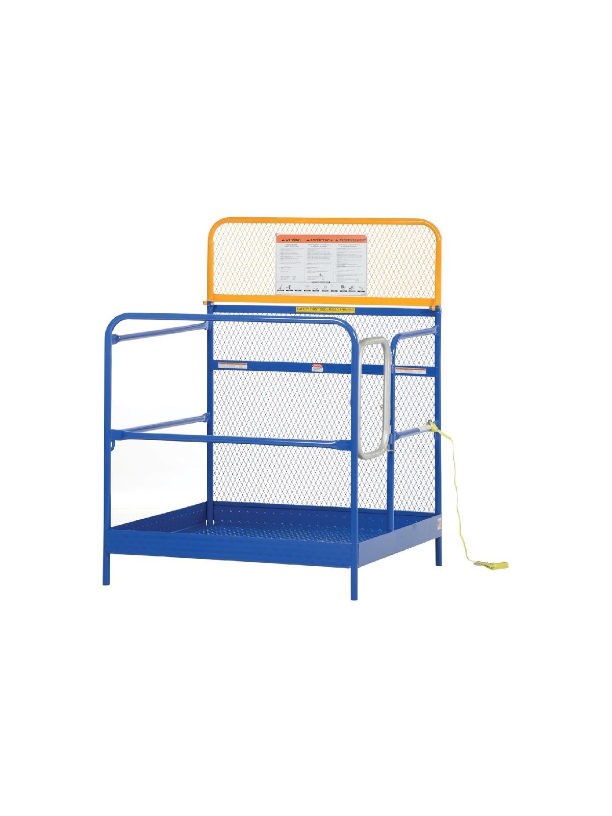 Convenient fork truck work platforms quickly and safely raise maintenance personnel where they are needed. Attaches to fork lift truck by inserting forks into fork pockets and securing platform to fork truck. Fork locks secure platform to forks and a 36" long safety restraint which hook attaches platform to fork truck. 42" high handrail with 21" high mid-rail on three sides. 60" high expanded metal backing on forth side (84" high backing to meet California OSHA available, call for details). Includes diamond plate platform. The usable fork pockets on single and dual side door entry are 7-3/4"W x 3-7/8"H in rear and 7-3/4"W x 1-7/8"H in front. The usable fork pockets on fold down work platform measure 7-7/8"W x 3-3/8"H on 27-3/4" centers. Steel construction with baked-in powder-coated toughness. FOB Shipping Point.